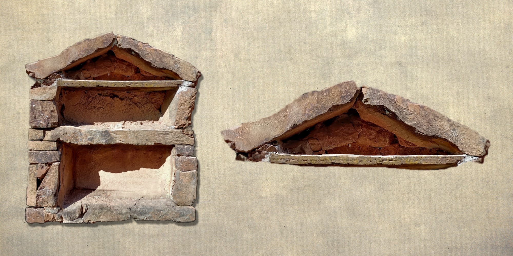 En estos nichos en el muro, apreciamos una curiosa solución, nada caprichosa, para solventar con éxito y habilidad un tremendo problema: el desplome de la pared por debilitamiento del muro. Para ello se recurre a desviar el peso de toda la pared poniendo dos piedras en forma de “uve” invertida.