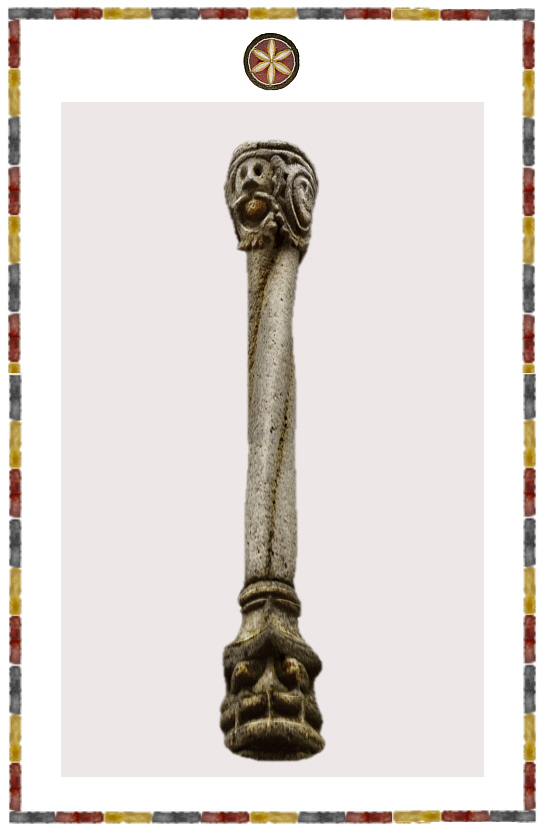 Continúa en su descripción diciéndonos que por encima del vano, en la enjuta de los dos arcos que lo conforman, hay un escudete que contiene un brazo con una especie de látigo, uno de los conocidos símbolos inquisitoriales.